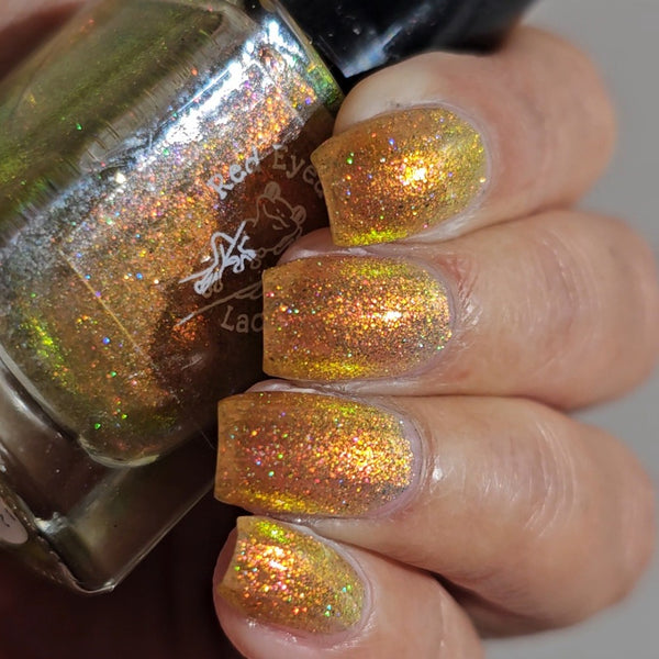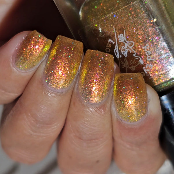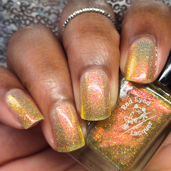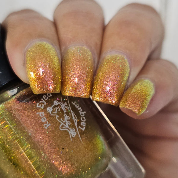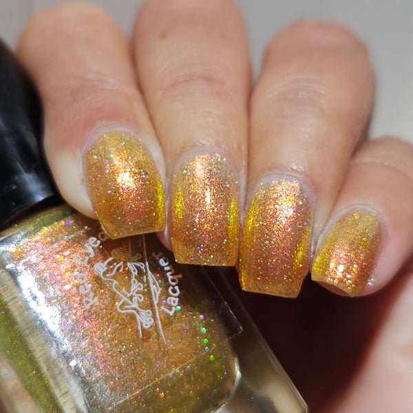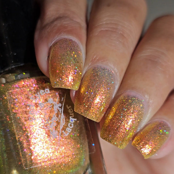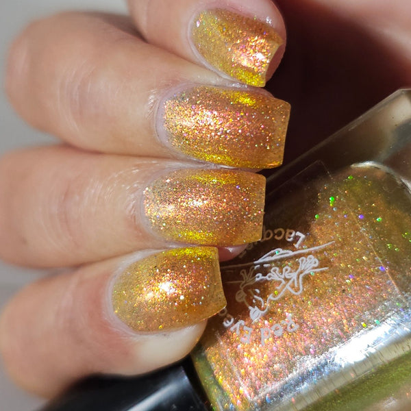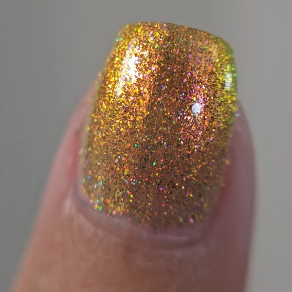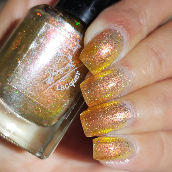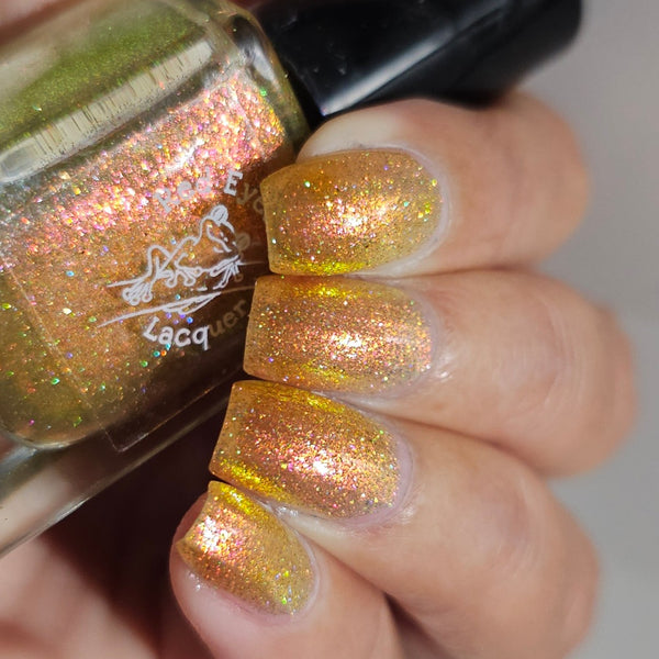 A pale gold with gold/orange shifting shimmer and gold scattered holo!