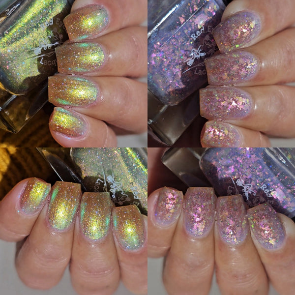 For The Memories: A light lavender purple crelly with pink/gold/green/orange shifting flakes and scattered holo