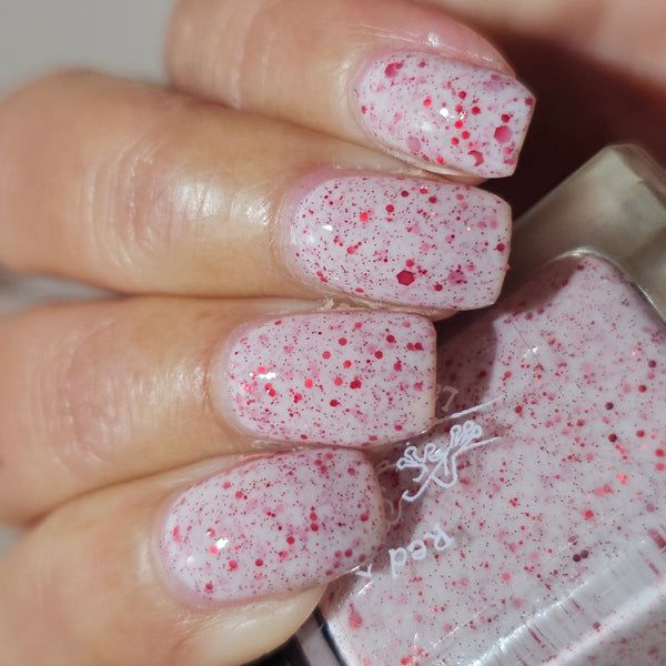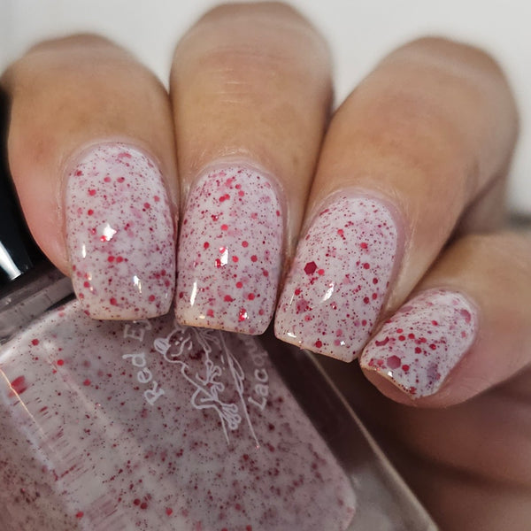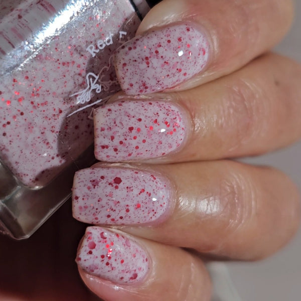 A white crelly with various sizes of red hex glitters!