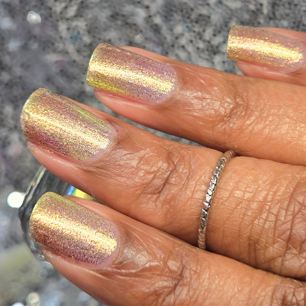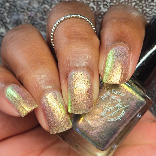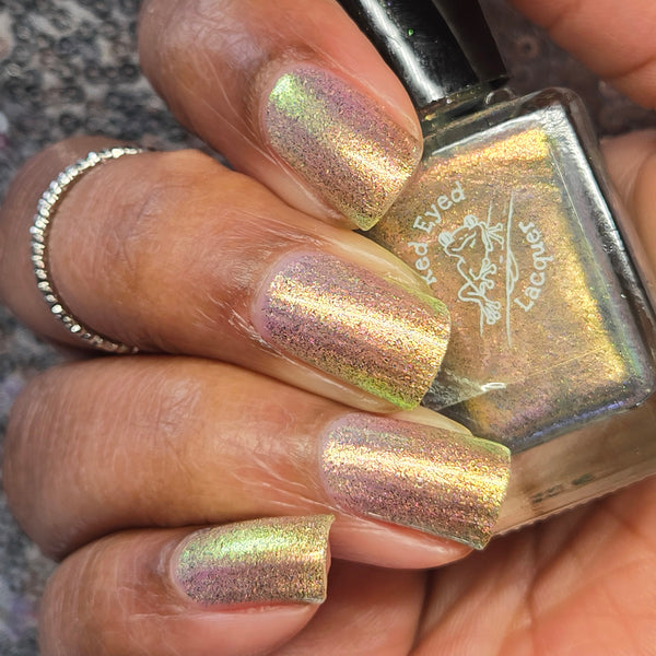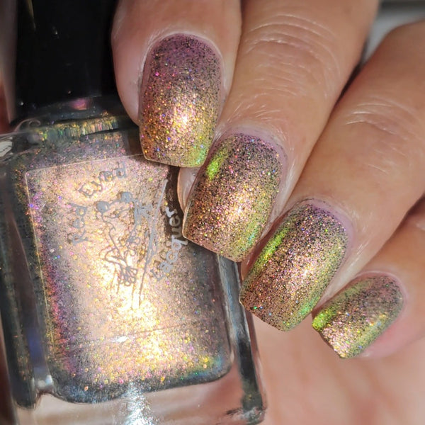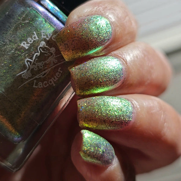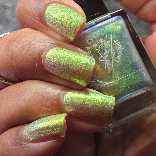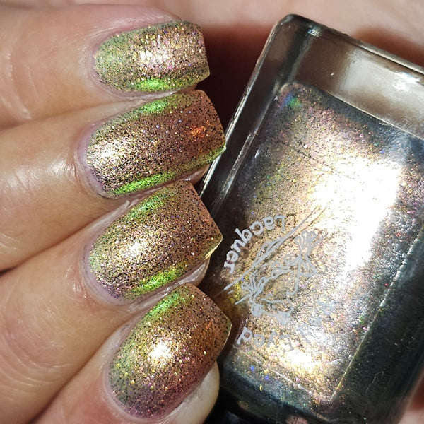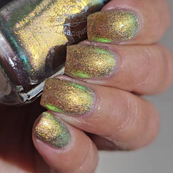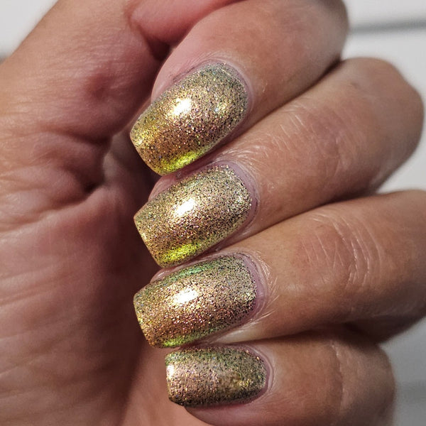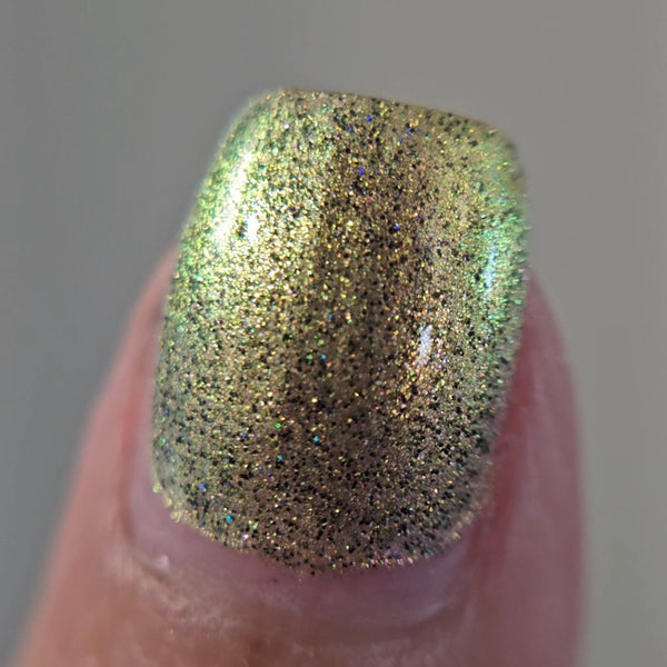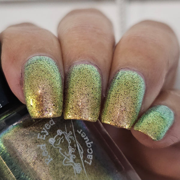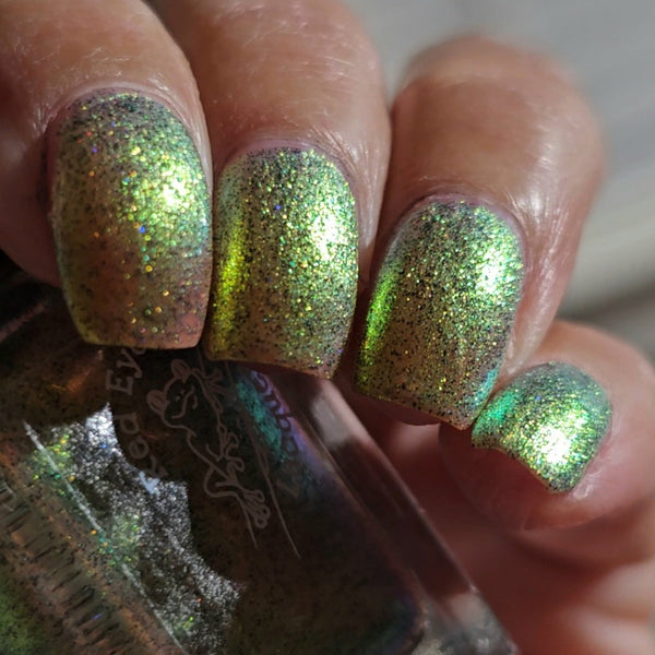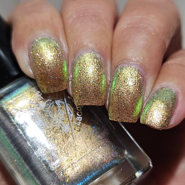 A green/gold shifting shimmer with black holo micro glitters!
